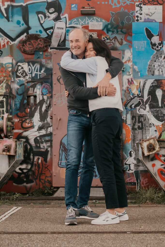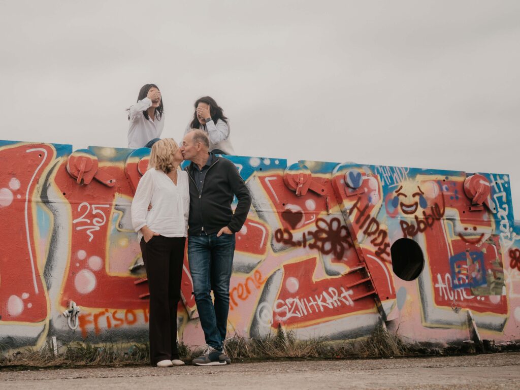 Zijn vrouw en kinderen hadden iets speciaals bedacht: een verrassingsfotoshoot bij Leukfotografie, midden op het stoere NDSM-terrein in Amsterdam Noord. Tijdens de lunch op het terrein mocht ik erbij aanschuiven om het nieuws te brengen en Erik had het écht niet zien aankomen. De verrassing was groot, maar de sfeer al snel ontspannen. Er werd gelachen, geplaagd en genoten, precies zoals het hoort bij een familie die zichtbaar hecht is.